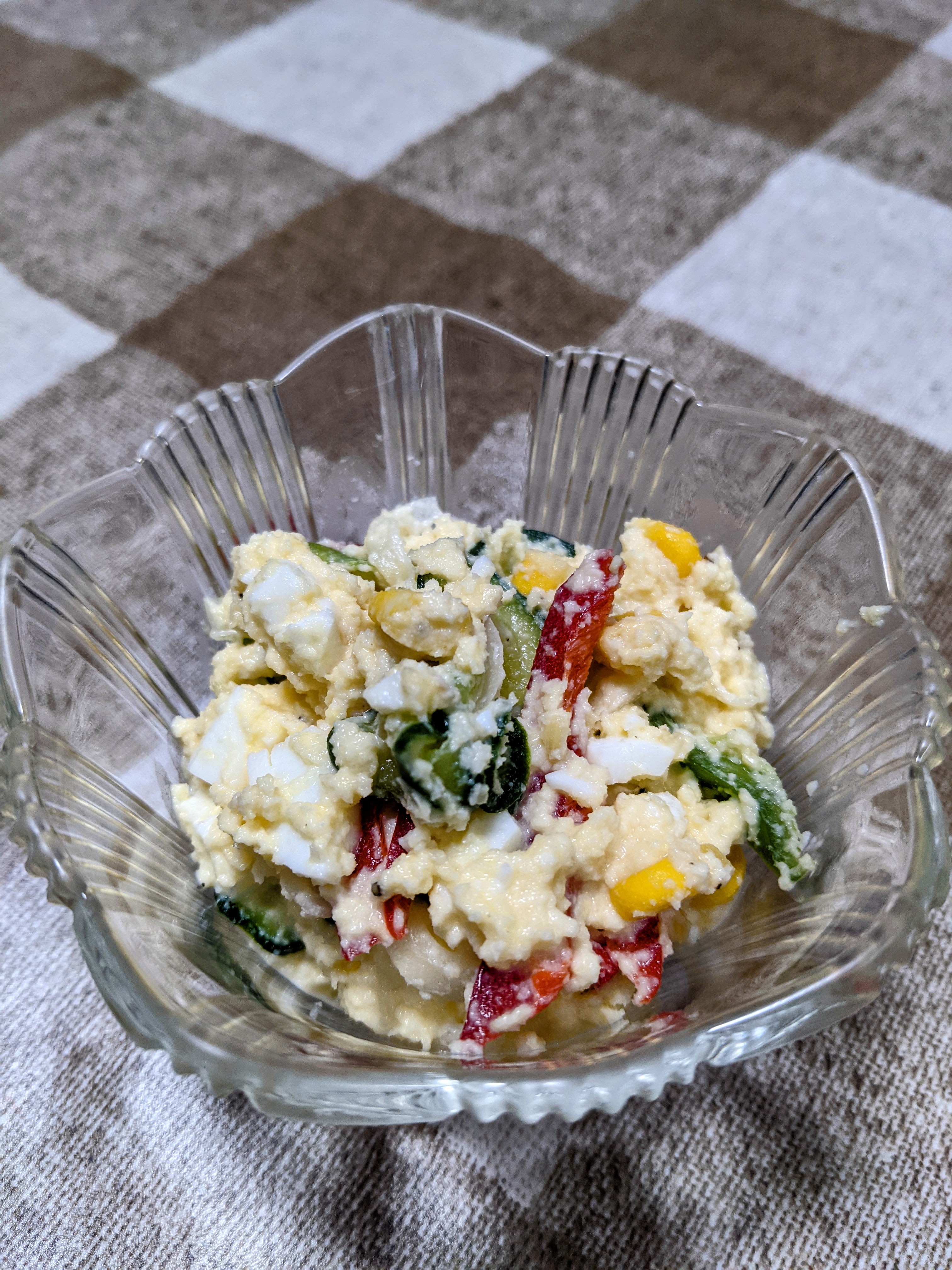 パプリカ、ピーマン、玉ねぎ、きゅうり、コーンを入れ、調味料のマヨネーズ、甘酢、塩、胡椒を適量入れ最後に豆乳入れて好みの柔らかさに仕上げれば出来上がり~