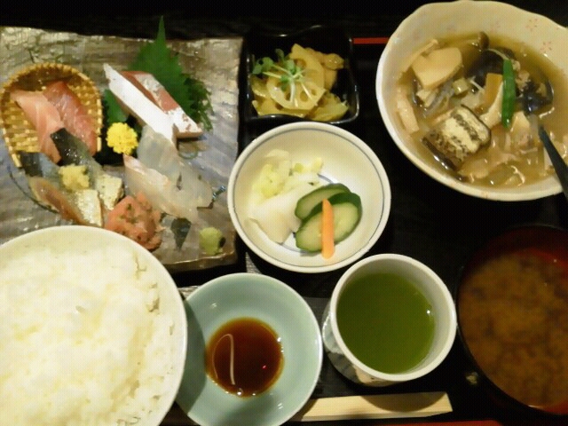 お刺身、主菜、小鉢、味噌汁、漬け物、御飯、お茶