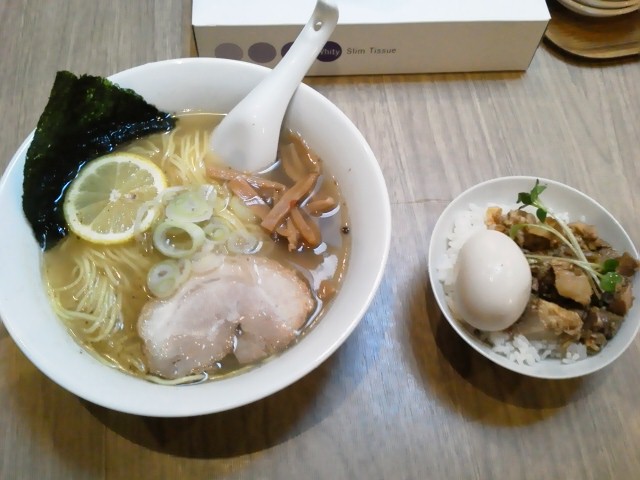 塩ラーメン+チャーシュー丼 880円 です。 Bセットが+TKG で 780円 だったと思います。 Aは忘れました^^; でもこの内容は毎回変わるかもしれません。 行ってみてのお楽しみ♪ 味はさっぱりで、ポイントはレモンがのってる所でしょうか。 チャーシューの味はちょっと濃い目かも。 煮卵は好きな感じでした。
