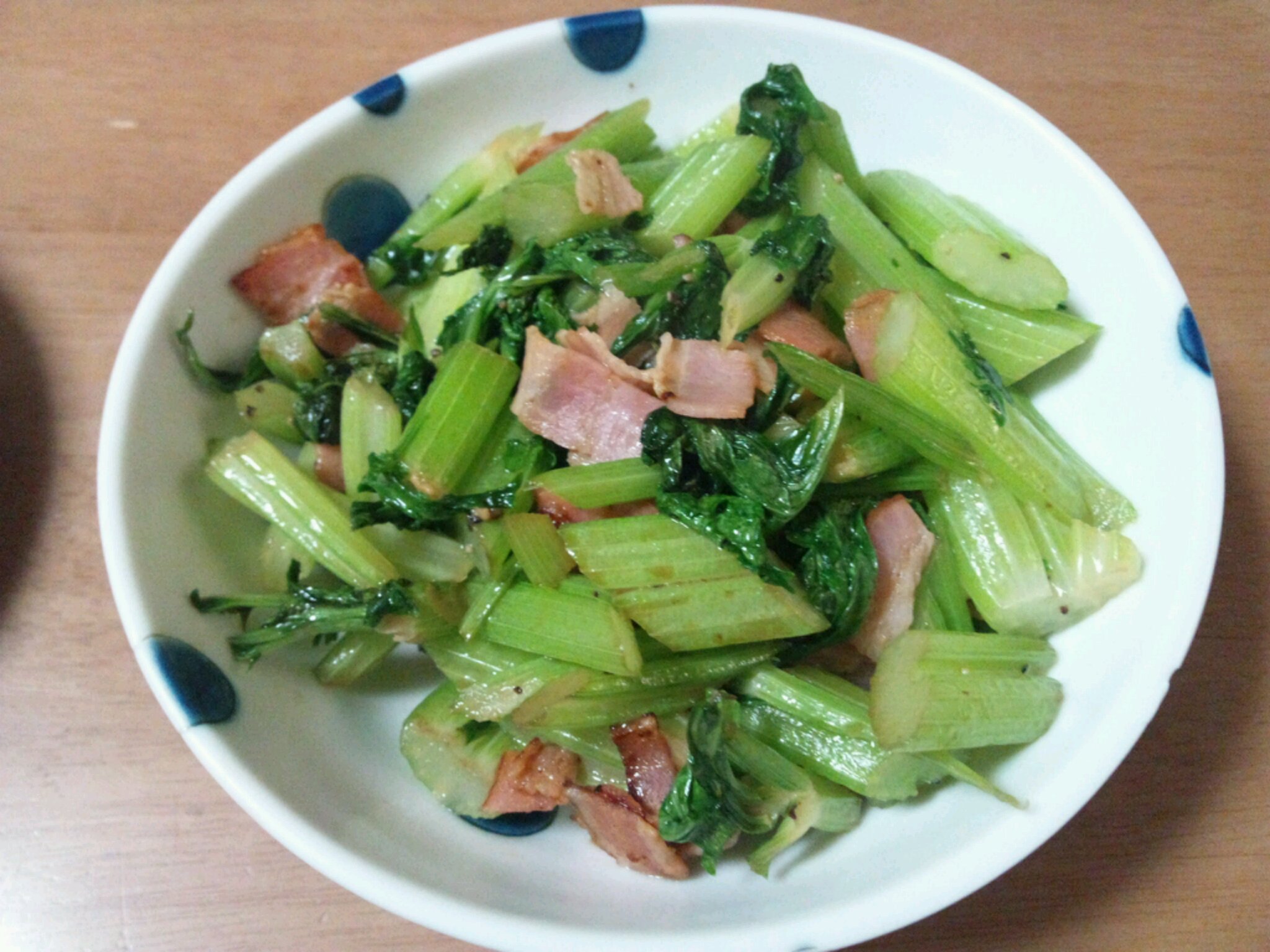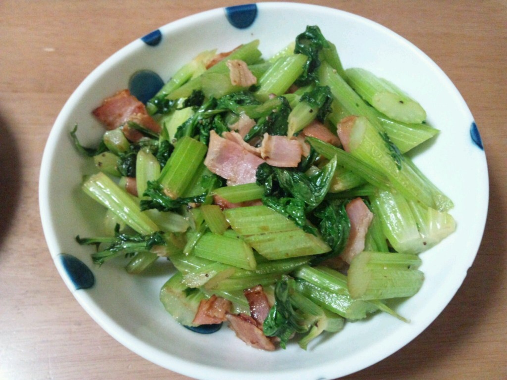 私は早速セルリーを 葉っぱも一緒にベーコンとガーリック風味で炒めて、