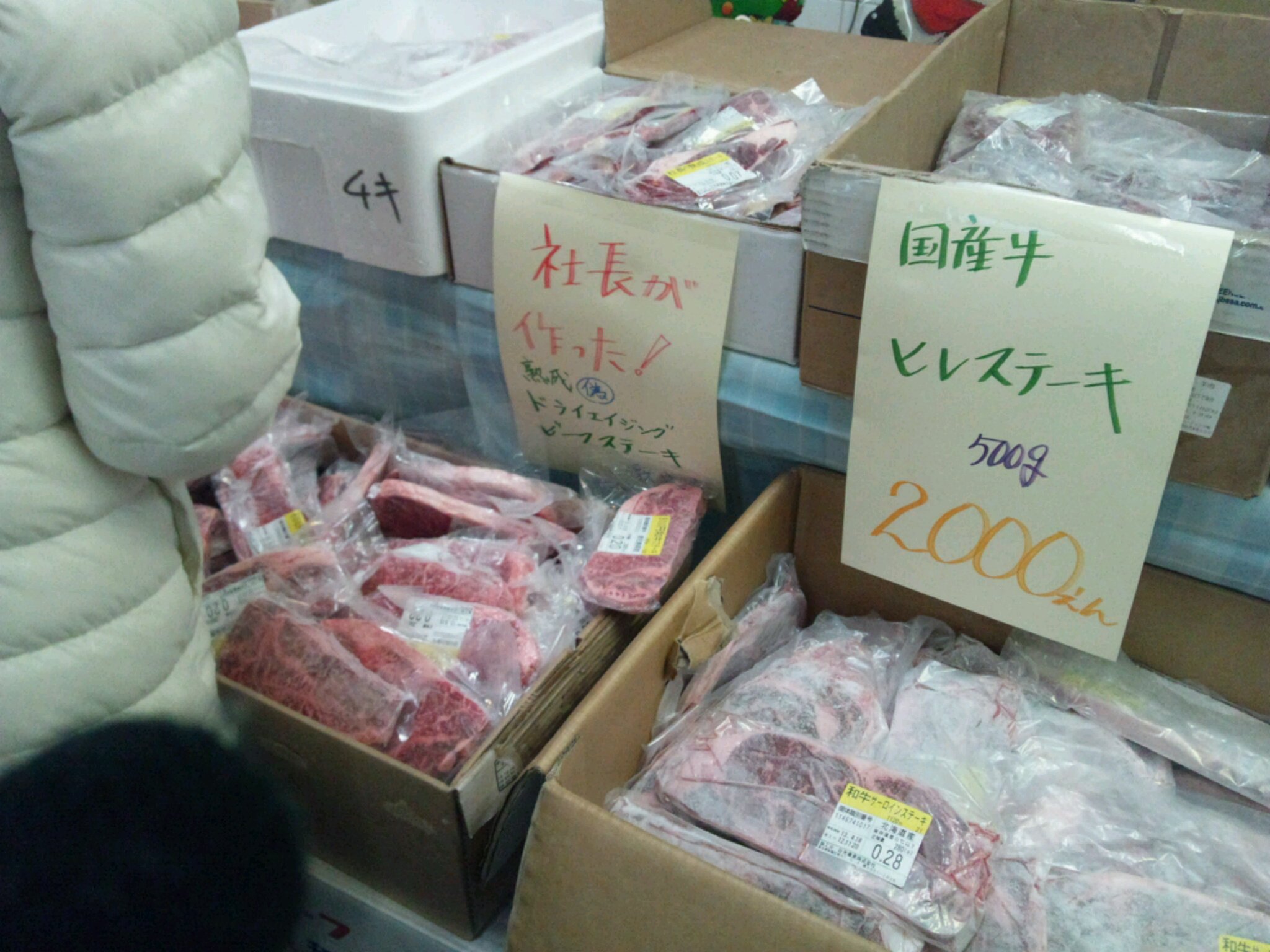 200㌘で700円のステーキ肉があったり牛肉の貴重な部位のみすじがあったり、豚肉、鶏肉、ベーコン他が、