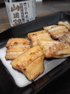 続いては醤油とみりんと酒を合わせたタレに漬け込んで軽く炙って頂きました。