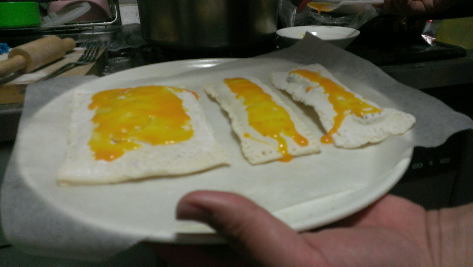 表面に穴を開けて卵の黄身を塗る 余熱しておいたレンジのオーブン機能で焼く