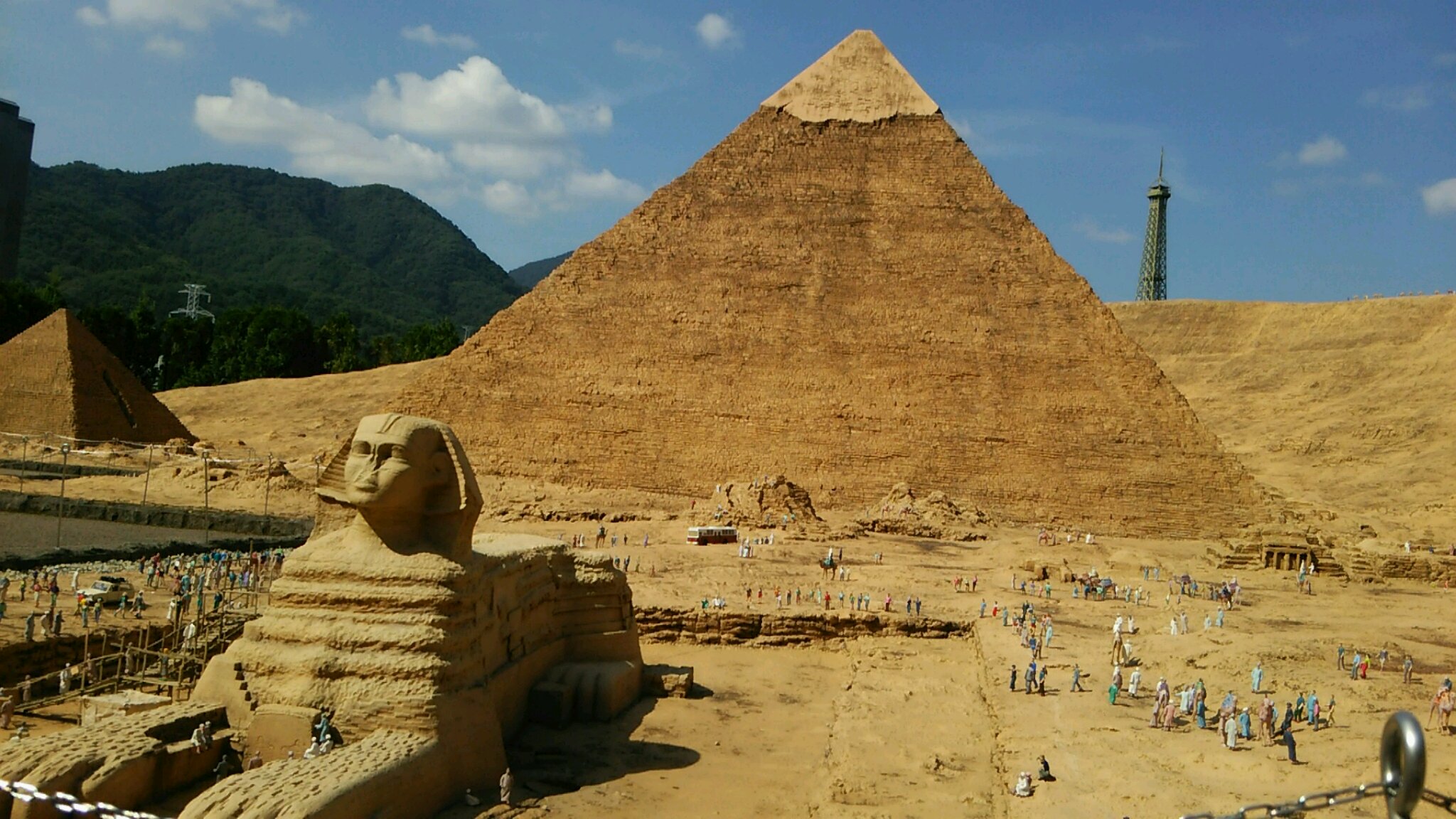 実は、これらの写真は、鬼怒川の東武ワールドスクエアで撮ってきました。 よ〜く見ると、エジプトの奥にエッフェル塔の先が写っていたり、緑の山があったり万里の長城の奥の木がデカくなっていたり、と不思議な写真になっています。