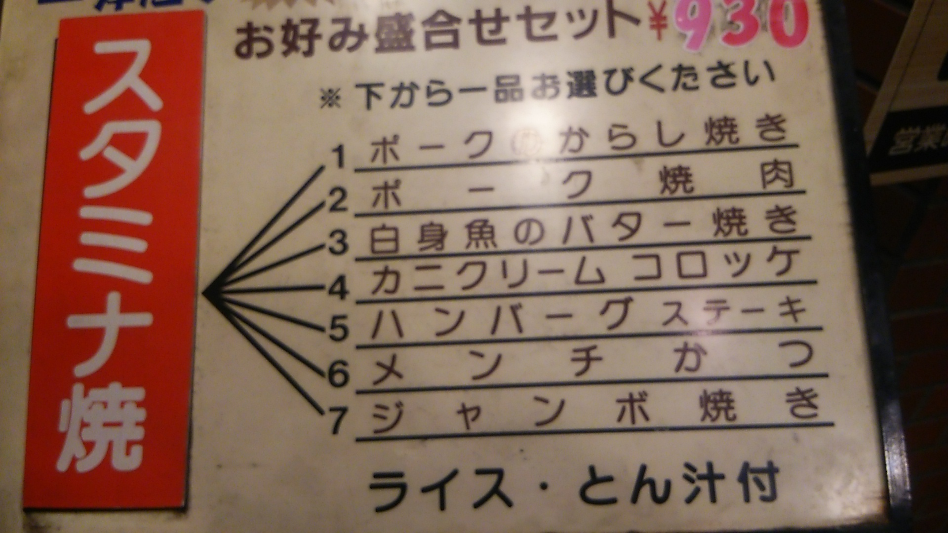 スタミナ焼きは固定で7つから選べるセットメニューで、今回はジャンボ焼きを頼みました。