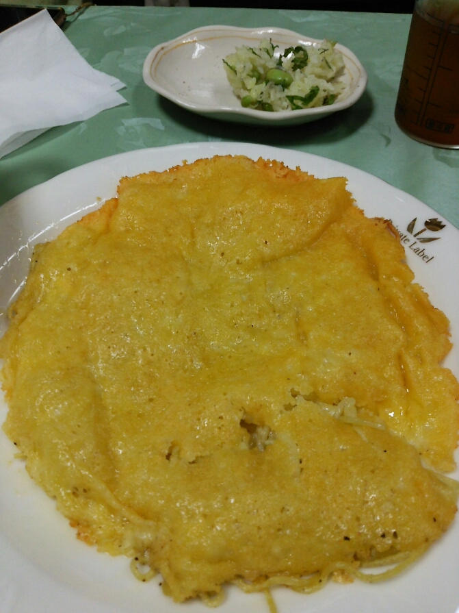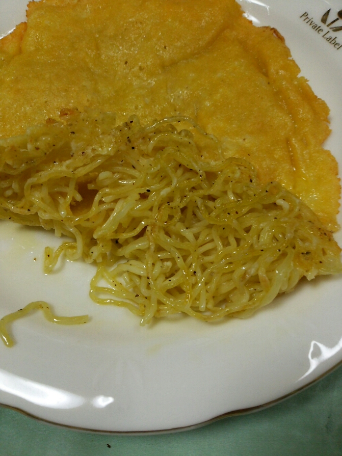 チーズが程よく焼けたらひっくり返しして焼きそばを焼きます。 焼きそばがパリパリに焼けたら出来上がりです。