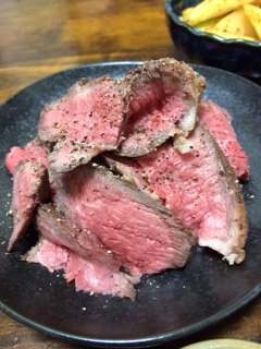 塩コショウで下味をつけたブロック肉を 軽く焦げ目がつく程度に焼いて 人肌程度の温度で数時間寝かせます